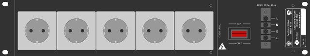 Блок розеток для раздачи сетевого напряжения в составе аппаратуры МЕТА, 5 розеток Schuko, U-ном. 220 В, I-ном. 20 А, габ.размеры 88х 482х100 мм.
