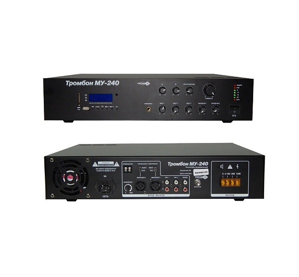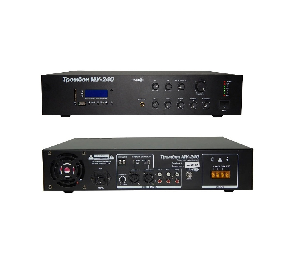 Микшер-усилитель мощностью 240 Вт, USB/SD -карт, USB, FM и Bluetooth-плеер, подключение до 6-ти источников аудио сигнала, 3 микрофонных, 2 линейных входа и 1 вход АТС. выходное напряжение 30В, 100В, 4-16 Ом, 100 - 16000 Гц, 2U, 438 х 360 х 88 мм.
