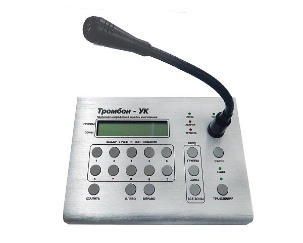 Количество коммутируемых зон вещания - 32; микрофонный вход, встроенный микрофон ; максимальное удаление до 1200м, 200х142х45 мм, 1 кг. Работает совместно с приборами "Тромбон-ПУ-4", "Тромбон-ПУ-8", "Тромбон–ПУ-М-хх"