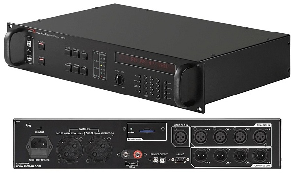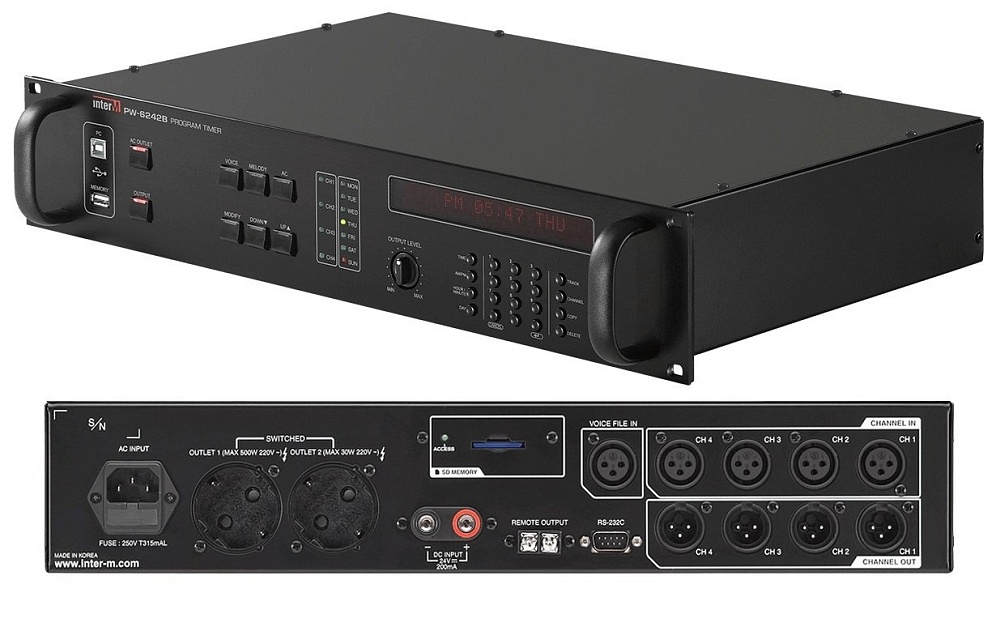 Таймер управляет недельным расписанием, электропитанием различных устройств. Он оснащен USB-портом типа 'B' и USB-портом типа 'A' для копирования аудиофайлов на SD-карту, SD карта 8 Gb в комплекте.