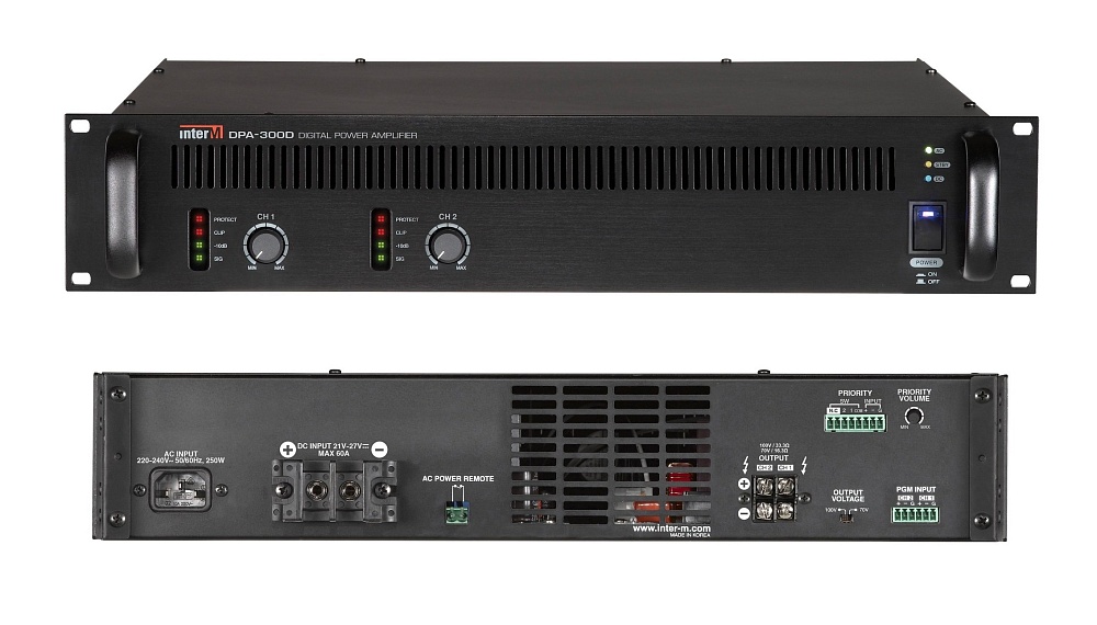 Двухканальный трансляционный цифровой усилитель мощности, 2 х 300 Вт, 50-20000 Гц, 482×88×434 мм.