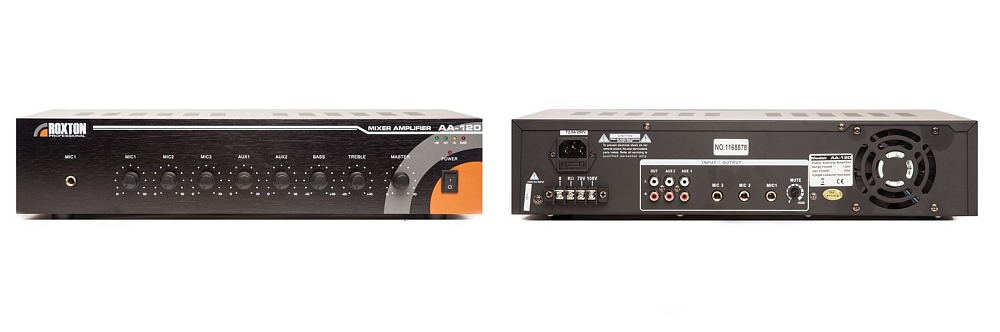 Усилитель 120 Вт; 100...16000 Гц; 100В/70В/8 Ом, 1+2 микроф./2 лин. входа, 1 лин. выход; ~220В; защита от перегрузки, КЗ, по пост. току; 440х92х330 мм; 13 кг