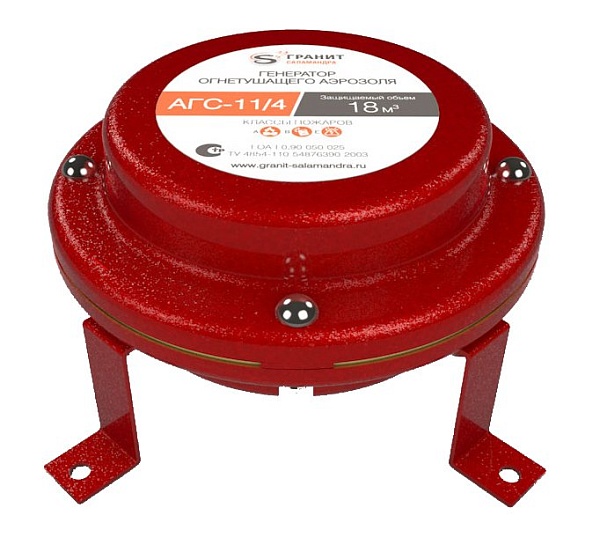Генератор огнетушащего аэрозоля универсальный с воздушным охлаждением; V-защ. 18.0 м.куб., t-раб. 25 сек., 214х214х97 мм, 2.0 кг. Установка на лапки. Встраиваемый узел запуска.