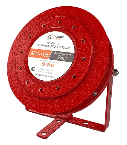 Генератор огнетушащего аэрозоля универсальный с воздушным охлаждением; V-защ. 28.0 м.куб., t-раб. 50 сек., 235х196х217 мм, 4.0 кг. Установка на кронштейн. Вкручиваемый узел запуска.