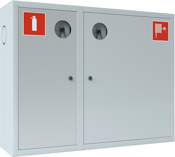 Шкаф пожарный для 1 рукава и 1 огнетушителя, навесной, закрытый, левый, с почтовым замком, 840х650х230 мм. Белого цвета. Корзина для пожарного рукава в комплекте.