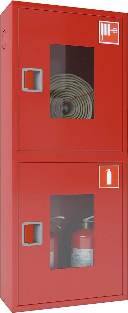 Шкаф пожарный для 1 рукава и 2 огнетушителей, накладной, открытый, петли справа, с почтовым замком, 540х1300х230 мм. Красного цвета. Корзина для пожарного рукава в комплекте.
