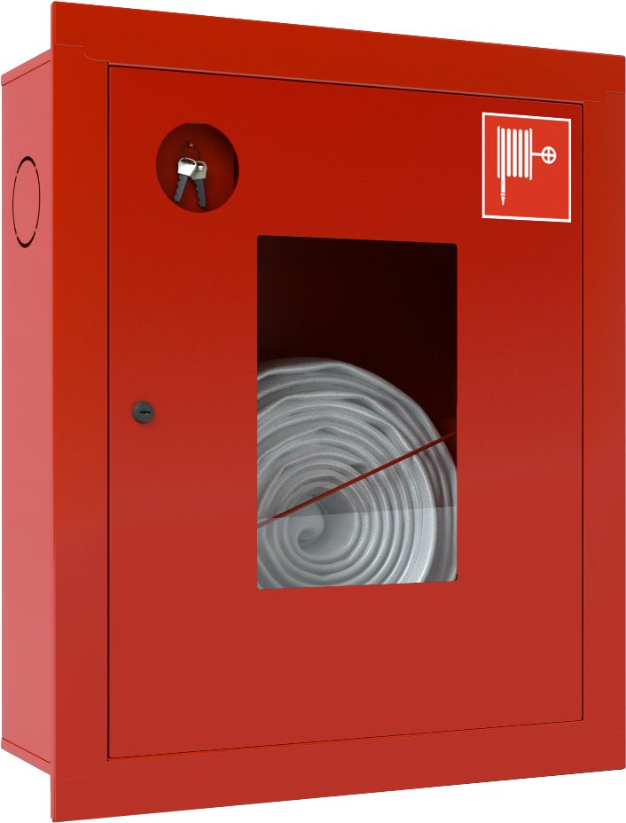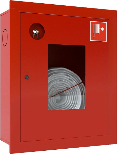 Шкаф пожарный для 1 рукава, встраиваемый, открытый, петли слева, с почтовым замком, 540х650х230 мм. Красного цвета. Корзина для пожарного рукава в комплекте.