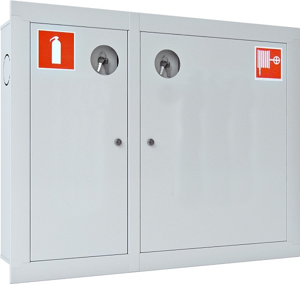 Шкаф пожарный для 1 рукава и 1 огнетушителя, встраиваемый, закрытый, правый, с почтовым замком, 840х650х230 мм. Белого цвета. Корзина для пожарного рукава в комплекте.