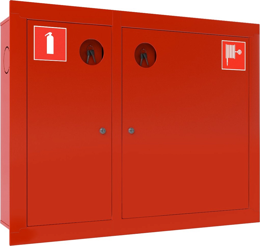 Шкаф пожарный для 1 рукава и 1 огнетушителя, встраиваемый, закрытый, левый, с почтовым замком, 840х650х230 мм. Красного цвета. Корзина для пожарного рукава в комплекте.