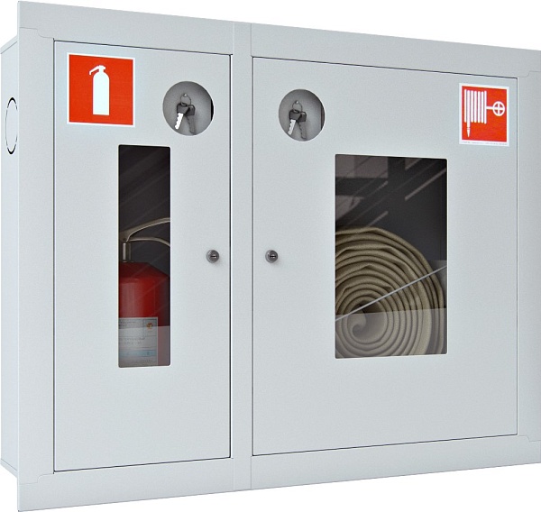 Шкаф пожарный для 1 рукава и 1 огнетушителя, встраиваемый, открытый, левый, с почтовым замком, 840х650х230 мм. Белого цвета. Корзина для пожарного рукава в комплекте.