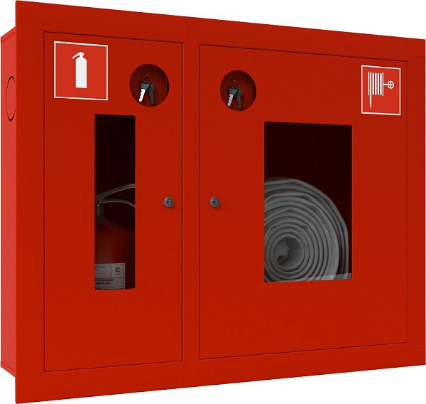 Шкаф пожарный для 1 рукава и 1 огнетушителя, встраиваемый, открытый, правый, с почтовым замком, 840х650х230 мм. Красного цвета. Корзина для пожарного рукава в комплекте.