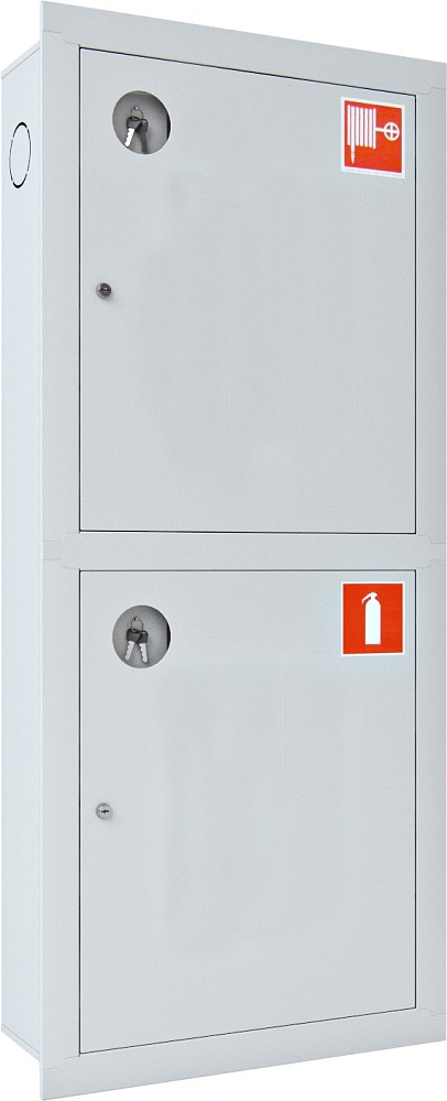 Шкаф пожарный для 1 рукава и 2 огнетушителей, встраиваемый, закрытый, петли справа, с почтовым замком, 540х1300х230 мм. Белого цвета. Корзина для пожарного рукава в комплекте.