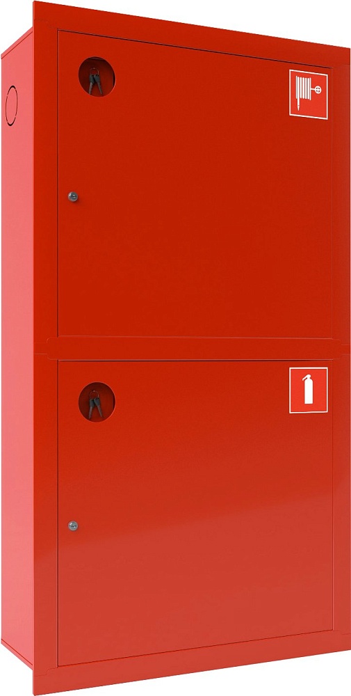 Шкаф пожарный для 1 рукава и 2 огнетушителей, встраиваемый, закрытый, петли справа, с почтовым замком, 540х1300х230 мм. Красного цвета. Корзина для пожарного рукава в комплекте.
