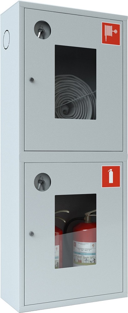 Шкаф пожарный для 1 рукава и 2 огнетушителей, накладной, открытый, петли справа, с почтовым замком, 540х1300х230 мм. Белого цвета. Корзина для пожарного рукава в комплекте.