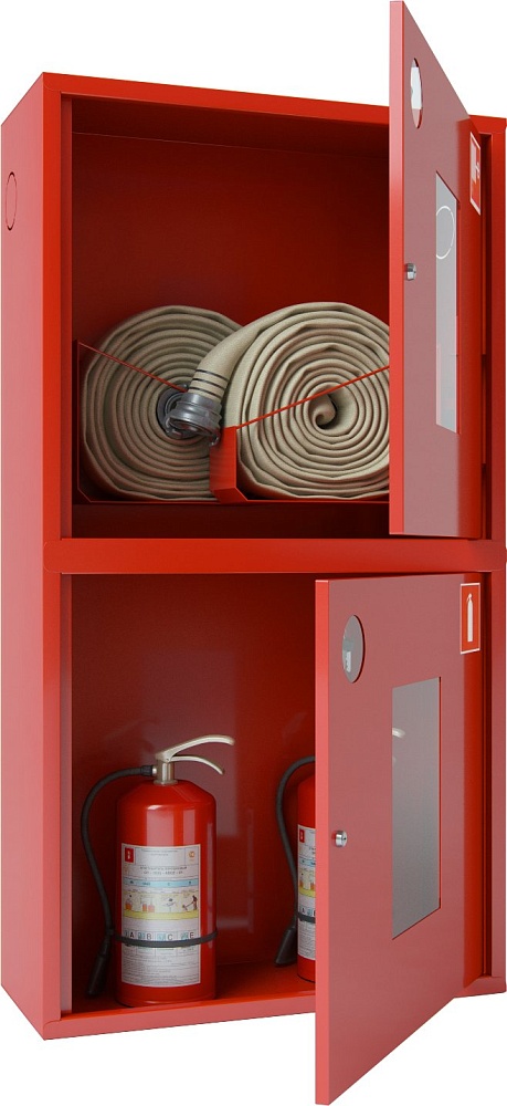 Шкаф пожарный для 2-х рукавов и 2-х огнетушителей, накладной, открытый, петли справа, с почтовым замком, 700х1300х300 мм. Красного цвета. Корзина для пожарного рукава в комплекте.