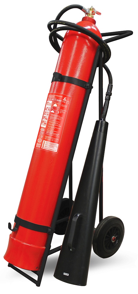 Огнетушитель углекислотный передвижной (1 баллон на тележке), огнетушащая способность 113В, С, Е; масса огнетушащего вещества 25-1.25 кг, продолжительность подачи ОТВ 15 сек, t-раб.-40…+50°С, габ.размеры (высота, ширина по длине шасси) 1500х480 мм, 110 кг
