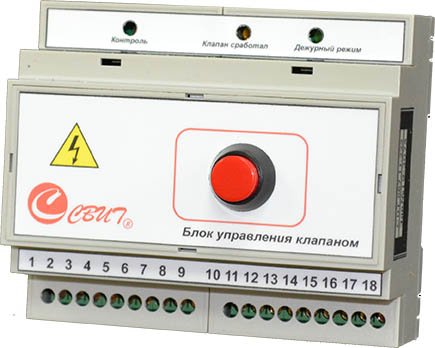 Блок управления противопожарными клапанами; 1 управляемый клапан, элекромеханический, I-потр.4 А; 1 вход управления, U-управ.220 В, I-ном.5 А; 1 выходное реле, U-коммут.250 В, I-коммут.8 А; U-пит.187...242 В, P-потр.10 ВА; IP20, t-раб.-30...+50°С, 105х90х70 мм. Пластиковый корпус.
