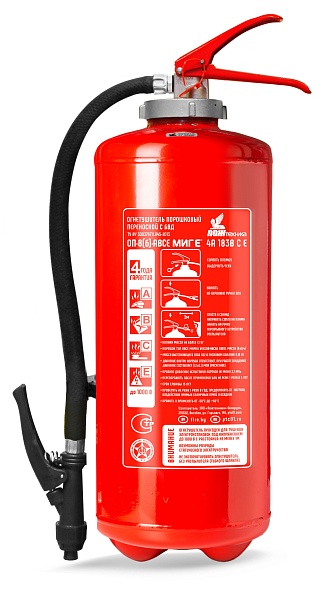 Огнетушитель порошковый, огнетушащая способность 4А, 183В, масса огнетушащего вещества 8 кг, объем баллона 10 л, продолжительность подачи ОТВ 15 сек, t_раб.-50…+50°С, 590х185 мм, 13 кг