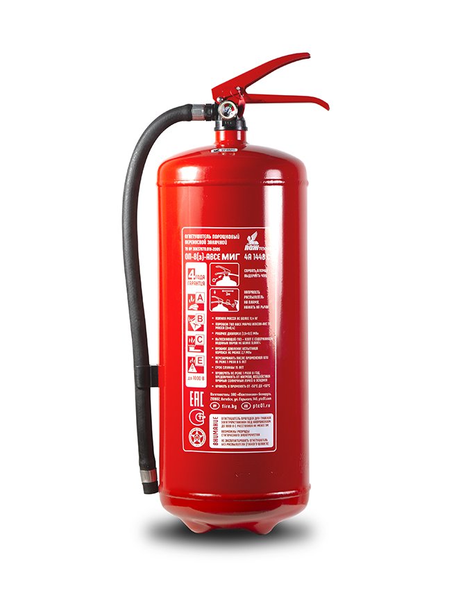 Универсальный порошковый огнетушитель с повышенной огнетушащей способностью закаченный осушённым азотом; ранг огнетушителя 4А,144В,С,Е, площадь тушения 18.66 кв.м., марка порошка «Вексон-АВС 25», вес огнетушащего порошка 8 кг, объем баллона 10 литра, время подачи огнетушащего вещества 15 секунд; диаметр баллона 180 мм; t-раб.-50...+50°С. Вес огнетушителя: 11.4 кг.