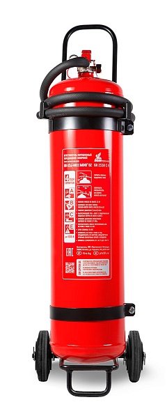 Передвижной малогабаритный порошковый огнетушитель с повышенной огнетушащей способностью закаченный осушённым азотом; ранг огнетушителя 6А,233В,С,Е, площадь тушения 27.7 кв.м., марка порошка «Вексон-АВС 50», вес огнетушащего порошка 12 кг, объем баллона 15 литра, время подачи огнетушащего вещества 20 секунд; диаметр баллона 180 мм; t-раб.-40...+50°С. Вес огнетушителя: 23 кг.