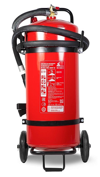 Передвижной порошковый огнетушитель с повышенной огнетушащей способностью с перекрываемым стволом; ранг огнетушителя 10А,233В,С,Е, площадь тушения 46.04 кв.м., марка порошка «Вексон-АВС 25», вес огнетушащего порошка 50 кг, объем баллона 62 литра, длина струи 6 м, время подачи огнетушащего вещества 20 секунд; диаметр баллона 330 мм; t-раб.-40...+50°С. Вес огнетушителя: 80 кг.