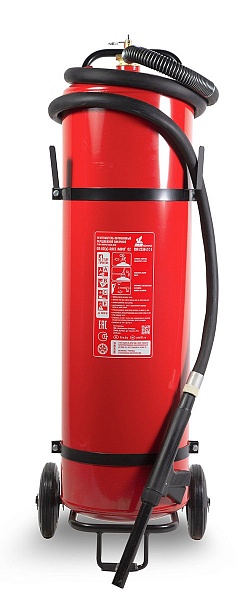 Передвижной порошковый огнетушитель с повышенной огнетушащей способностью закаченный осушённым азотом; ранг огнетушителя 10А,233В,С,Е, площадь тушения 46.04 кв.м., марка порошка «Вексон-АВС 25», вес огнетушащего порошка 80 кг, объем баллона 90 литра, длина струи 6 м, время подачи огнетушащего вещества 20 секунд; диаметр баллона 330 мм; t-раб.-40...+50°С. Вес огнетушителя: 115 кг.