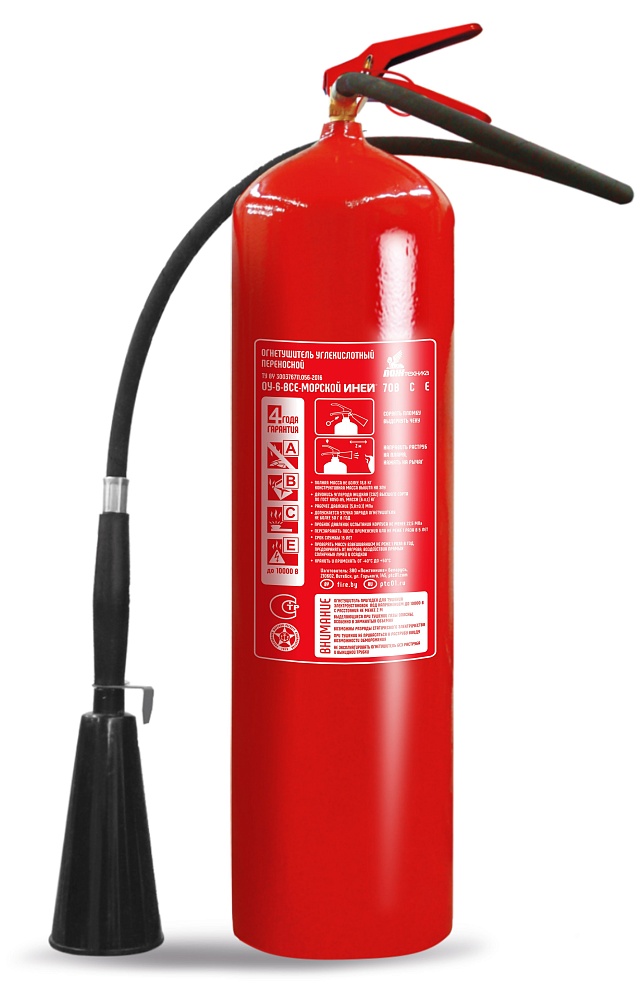 Огнетушитель углекислотный, огнетушащая способность 70В, С, Е; масса огнетушащего вещества 6-0.3 кг, продолжительность подачи ОТВ 10 сек, t-раб.-40…+50°С, габ.размеры Ø160, высота 730 мм, 18 кг