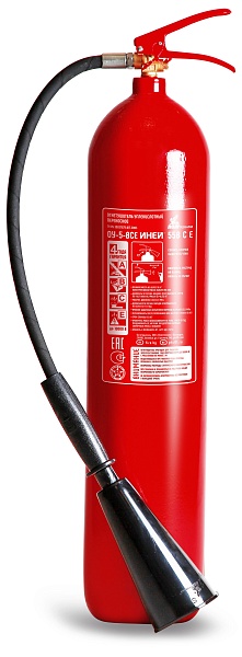 Огнетушитель углекислотный, огнетушащая способность 55В, С, Е; масса огнетушащего вещества 5+0.25 кг, продолжительность подачи ОТВ 8 сек, t-раб.-40…+50°С, габ.размеры Ø150, высота 900 мм, 18 кг