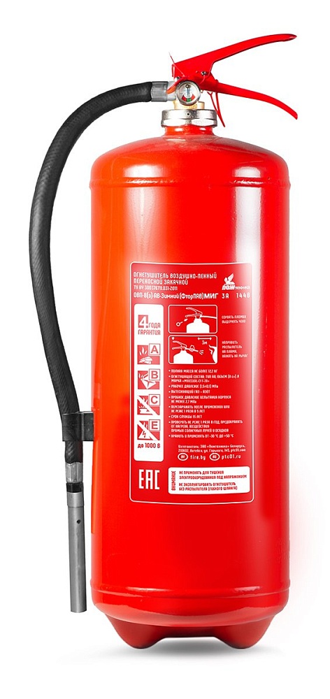 Огнетушитель воздушно-пенный, огнетушащая способность 2А, 89В, масса огнетушащего вещества 8 кг, объем баллона 10 л, продолжительность подачи ОТВ 30 сек, t_раб.-40…+50°С, 580х185 мм, 12.2 кг