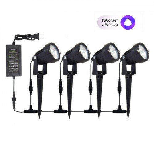 Светильник садово-парковый уличный, монтаж накладной/в грунт, 4 лампы на проводе длиной 8 м, регулировка спектра RGB, яркости и цветовой температуры в приложении Sibling, работает с Алисой®; Wi-Fi, 2.4 ГГц, 802.11 b\g\n, U-раб. 220 В, мощность 3 Вт каждой лампы, IP65