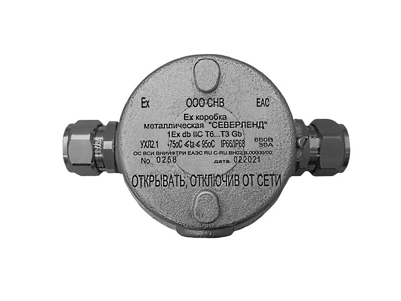 Коробка коммутационная взрывозащищенная, 1Ех db IIC T6...T5 Gb Х/1Ех db IIC T6...T3 Gb Х, алюминиевый сплав Д16Т; IP66/IP68, УХЛ2, t-раб. -75...+195 °С, габ.размеры 117 х 117 х 85мм. Комплектуются керамическими клеммниками (8 пар клемм); U-коммут. 660 В, I-коммут. 30 А, S-жилы до 6 мм². "Проходная": под 2 кабельных ввода или Ех заглушки (приобретаются отдельно).