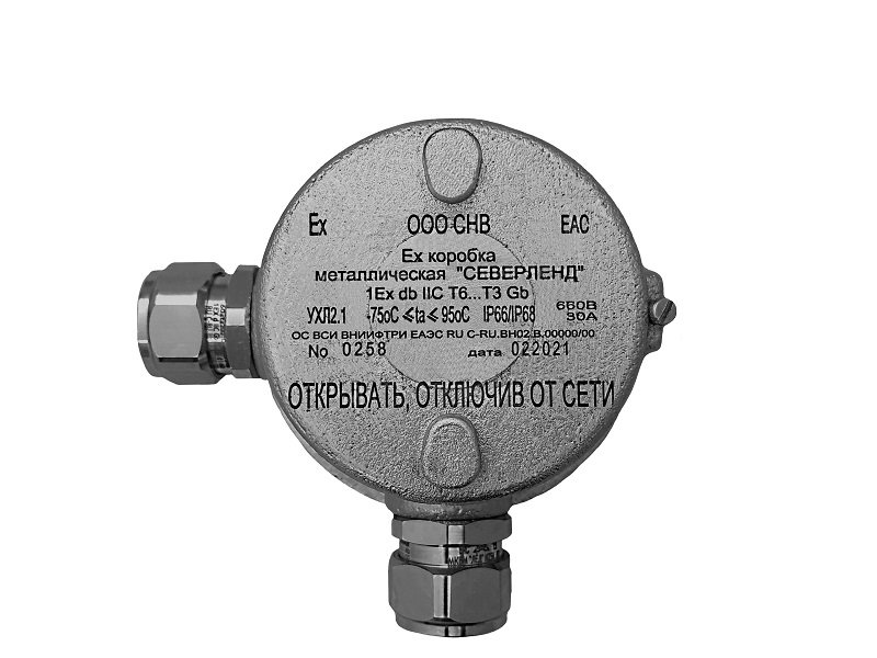 Коробка коммутационная взрывозащищенная, 1Ех db IIC T6...T5 Gb Х/1Ех db IIC T6...T3 Gb Х, алюминиевый сплав Д16Т; IP66/IP68, УХЛ2, t-раб. -75...+195 °С, габ.размеры 117 х 117 х 85мм. Комплектуются керамическими клеммниками (8 пар клемм); U-коммут. 660 В, I-коммут. 30 А, S-жилы до 6 мм². "Угловая": под 2 кабельных ввода или Ех заглушки (приобретаются отдельно).