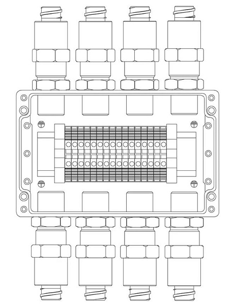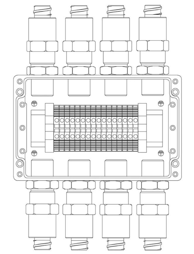 Коробка коммутационная взрывозащищенная 1ExeIIBT5Gb, клеммник 0.5...4 мм.кв. (I=25А) -16 шт, УХЛ1, IP67, t-раб.-60...+85°С, 100х160х81 мм. Корпус из алюминиевого сплава, универсальный кабельный ввод: под кабель 6...12 мм в металлорукаве 15 мм - 8 шт