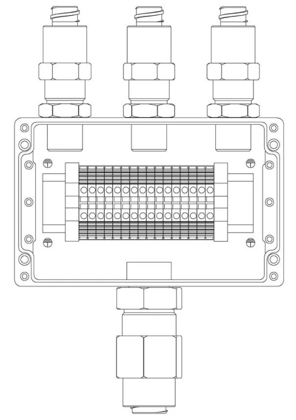 Коробка коммутационная взрывозащищенная 1ExeIIBT5Gb, клеммник 0.5...4 мм.кв. (I=25А) -16 шт, УХЛ1, IP67, t-раб.-60...+85°С, 100х160х81 мм. Корпус из алюминиевого сплава, универсальные кабельные вводы: под кабель 6...12 мм в металлорукаве 15 мм - 3 шт, под кабель 10...16 мм в металлорукаве 20 мм - 1 шт