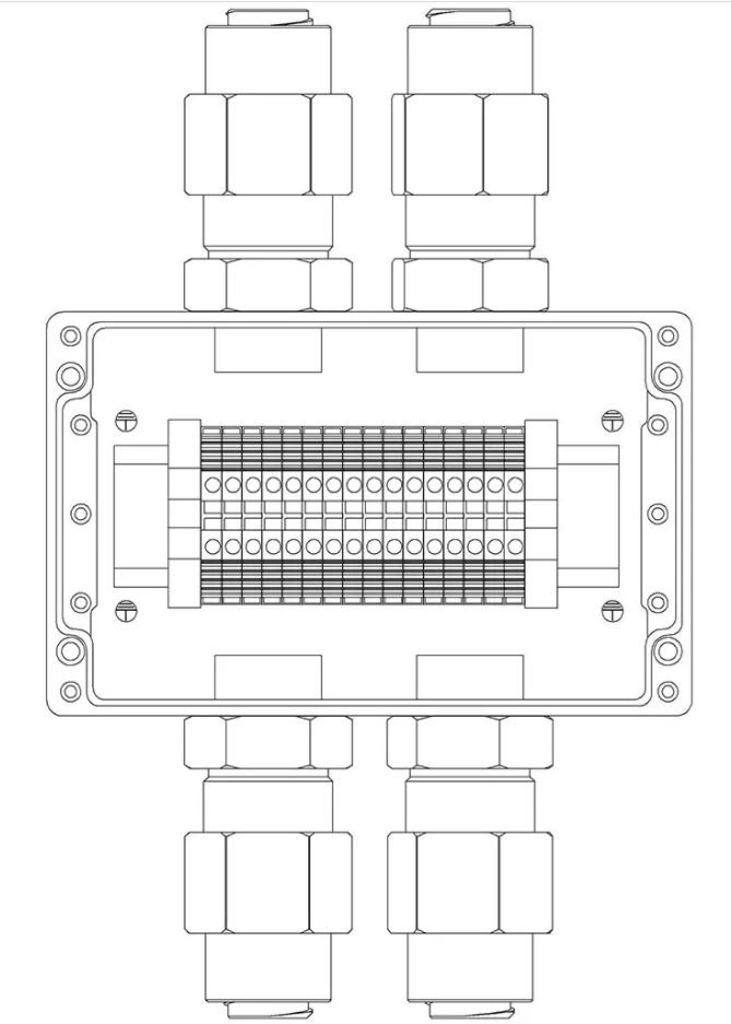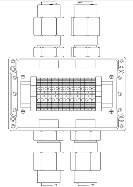 Коробка коммутационная взрывозащищенная 1ExeIIBT5Gb, клеммник 0.5...4 мм.кв. (I=25А) -16 шт, УХЛ1, IP67, t-раб.-60...+85°С, 100х160х81 мм. Корпус из алюминиевого сплава, универсальные кабельные вводы: под кабель 10...16 мм в металлорукаве 20 мм - 4 шт
