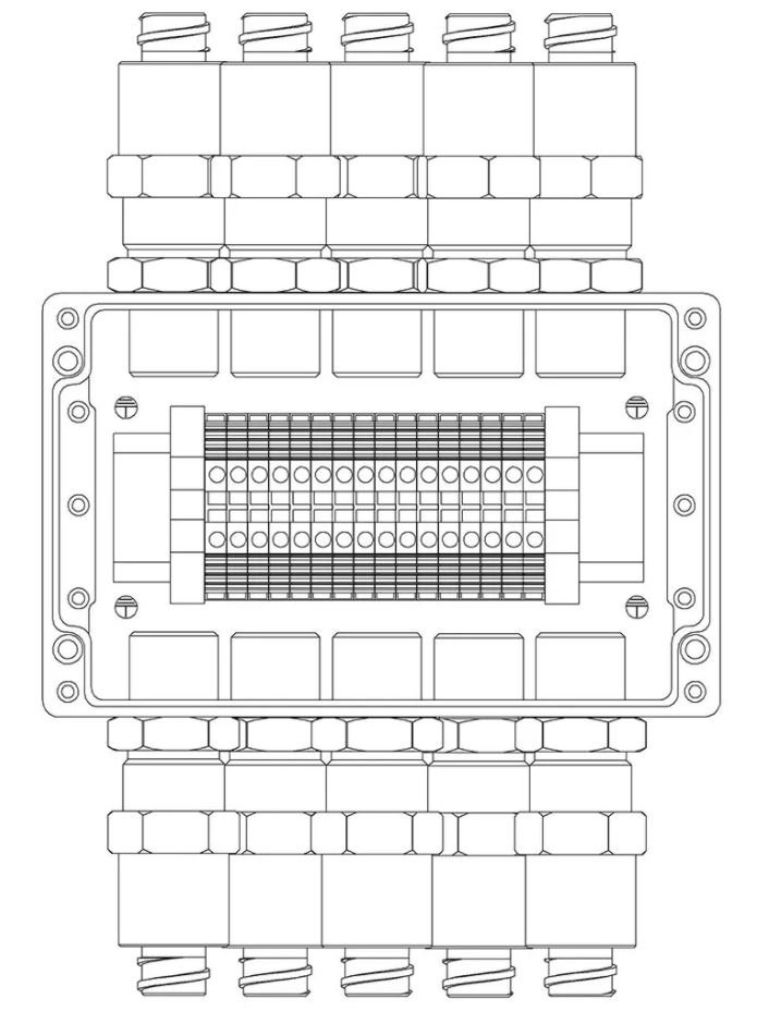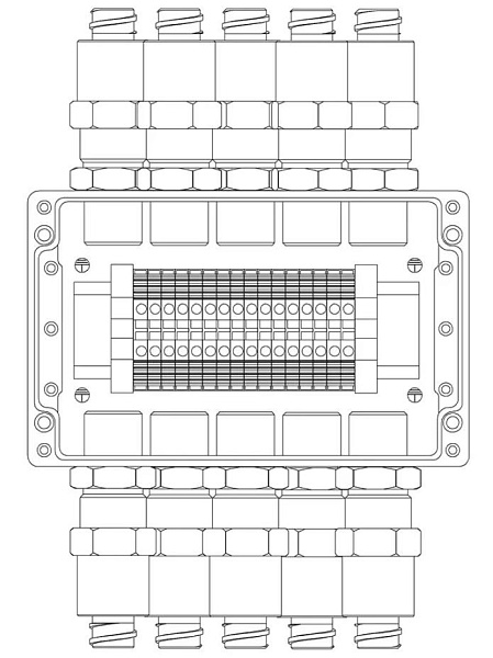 Коробка коммутационная взрывозащищенная 1ExeIIBT5Gb, клеммник 0.5...4 мм.кв. (I=25А) -16 шт, УХЛ1, IP67, t-раб.-60...+85°С, 160х160х91 мм. Корпус из алюминиевого сплава, универсальные кабельные вводы: под кабель 6...12 мм в металлорукаве 15 мм - 10 шт