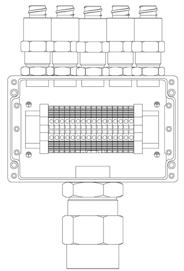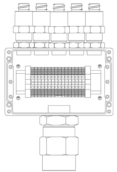 Коробка коммутационная взрывозащищенная 1ExeIIBT5Gb, клеммник 0.5...4 мм.кв. (I=25А) -16 шт, УХЛ1, IP67, t-раб.-60...+85°С, 160х160х91 мм. Корпус из алюминиевого сплава, универсальные кабельные вводы: под кабель 6...12 мм в металлорукаве 15 мм - 5 шт под кабель 16...22 мм в металлорукаве 25 мм - 1 шт