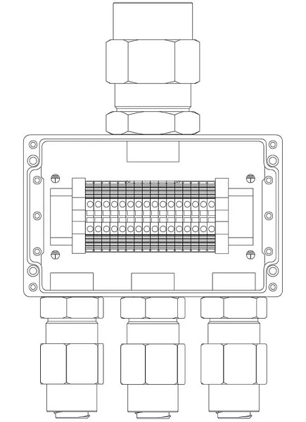 Коробка коммутационная взрывозащищенная 1ExeIIBT5Gb, клеммник 0.5...4 мм.кв. (I=25А) -16 шт, УХЛ1, IP67, t-раб.-60...+85°С, 160х160х91 мм. Корпус из алюминиевого сплава,универсальные кабельные вводы: под кабель 10...16 мм в металлорукаве 20 мм - 3 шт, под кабель 16...22 мм в металлорукаве 25 мм - 1 шт