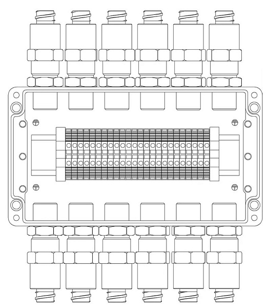 Коробка коммутационная взрывозащищенная 1ExeIIBT5Gb, клеммник 0.5...4 мм.кв. (I=25А) -24 шт, УХЛ1, IP67, t-раб.-60...+85°С, 120х220х91 мм. Корпус из алюминиевого сплава, универсальные кабельные вводы: под кабель 6...12 мм в металлорукаве 15 мм - 12 шт