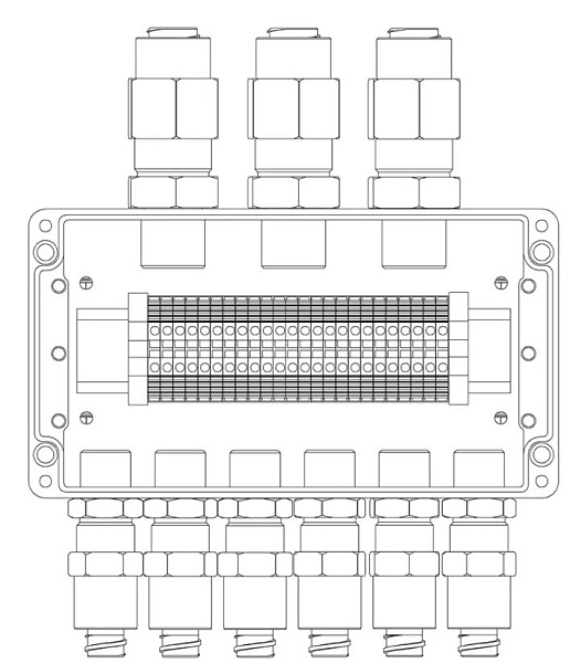 Коробка коммутационная взрывозащищенная 1ExeIIBT5Gb, клеммник 0.5...4 мм.кв. (I=25А) -24 шт, УХЛ1, IP67, t-раб.-60...+85°С, 120х220х91 мм. Корпус из алюминиевого сплава, универсальные кабельные вводы: под кабель 6...12 мм в металлорукаве 15 мм - 6 шт, под кабель 10...16 мм в металлорукаве 20 мм - 3 шт