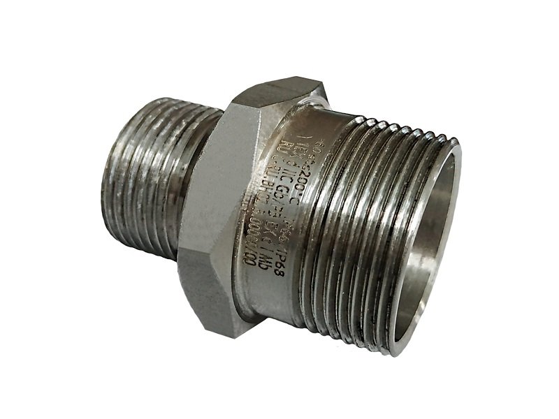 Переходник с внешней резьбы М20х1.5 на внешнюю резьбу М25х1.5, взрывозащищенный 1Ex db IIC Gb, PB Ex db I Mb, 1Ex e IIC Gb, 2Ex nR IIC Gc, Ex tb IIIC Db, РП Ex e I Mc, как Ех-компоненты - Ex db IIC Gb U, Ex db I Mb U, Ex e IIC Gb U, Ex nR IIC Gc U, Ex tb IIIC Db U, Ex e I Mc U; IP66/ IP68; длина резьбы 10 мм, размер под ключ 24 мм; IP66/ IP68, t-раб. -75...+250 °С. Нержавеющая сталь.