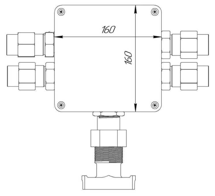 Коробка коммутационная взрывозащищенная для греющего кабеля с вводом под теплоизоляцию и индикацией 1Ex e IIB T5 Gb, клеммник 5х10мм, 2х10РЕ, УХЛ1, IP66, t-раб.-60...+85°С, 160х280х80мм. Корпус из алюминиево-кремниевого сплава, 4 кабельных ввода с заглушкой КВ М25