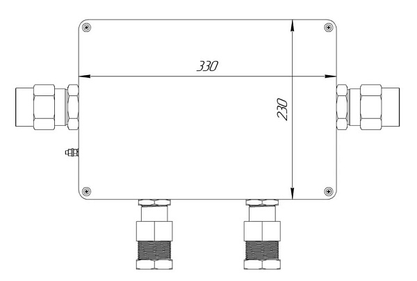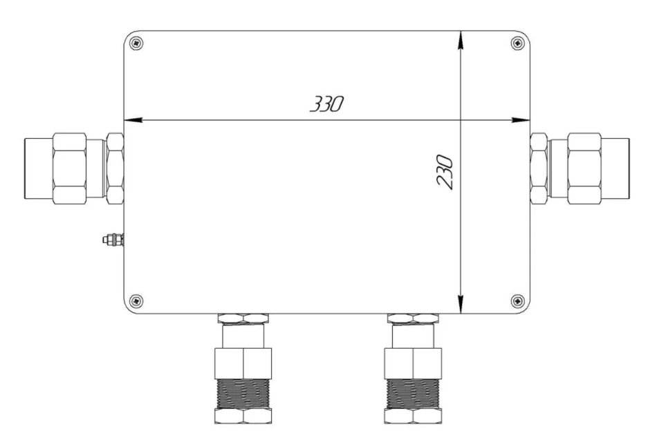Коробка коммутационная взрывозащищенная для греющего кабеля с вводом под теплоизоляцию 1Ex e IIB T5 Gb, клеммник 6х35мм, 6х35РЕ, УХЛ1, IP66, t-раб.-60...+85°С, 220х330х110мм. Корпус из алюминиево-кремниевого сплава, 2 кабельных ввода для силового кабеля с заглушкой КВ М32, 2 кабельных вывода с возможностью подключения до 6 греющих лент
