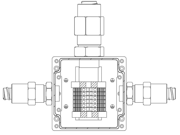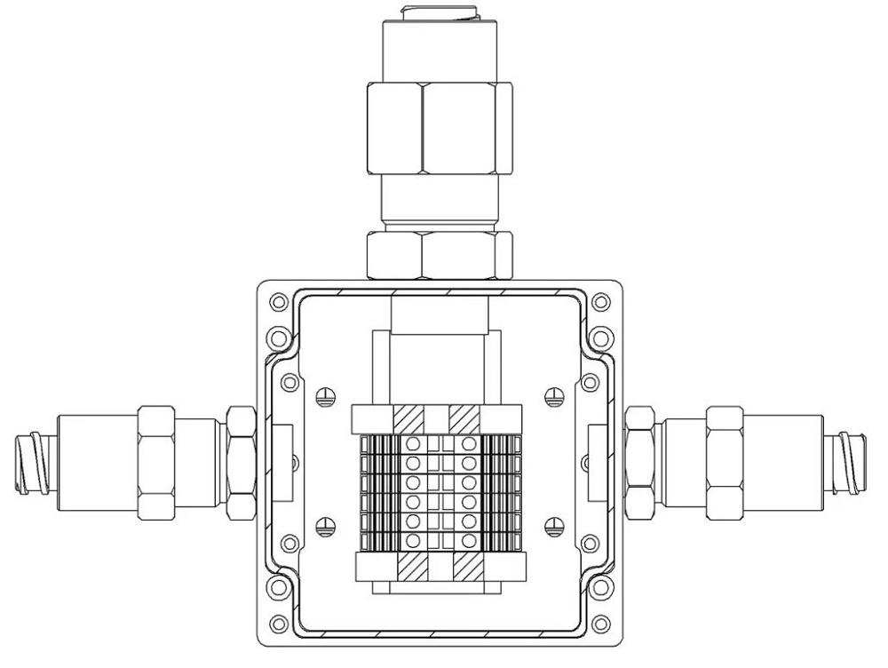 Коробка коммутационная взрывозащищенная 1ExeIIBT5Gb, клеммник 0.5...4 мм.кв. (I=25А) -6 шт, УХЛ1, IP67, t-раб.-60...+85°С, 100х100х81 мм. Корпус из алюминиевого сплава, универсальные кабельные вводы: под кабель 6...12 мм в металлорукаве 15 мм - 2 шт, под кабель 10...16 мм в металлорукаве 20 мм - 1 шт