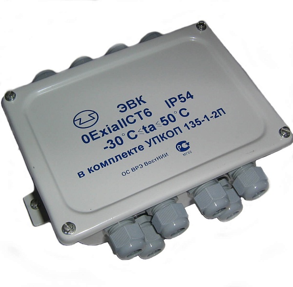 Элемент выносной коммутирующий ЭВК [0ЕхiаIIСT6] УПКОП 135-1-2П, для установки во взрывоопасных зонах любого класса. Совместно с ЭВК в искробезопасный шлейф сигнализации и управления ШСО"i" БИВ УПКОП135-1-2П могут быть подключены дополнительные элементы контроля, управления, оповещения, пуска и сигнализации (10 выходов, U-вых 12...24В, I-вых 171 мА суммарно). Металлический корпус, оснащен гермовводами, t-раб. -40...+50°С; IP54; габ.размеры 161×205×86 мм; вес 0,8 кг