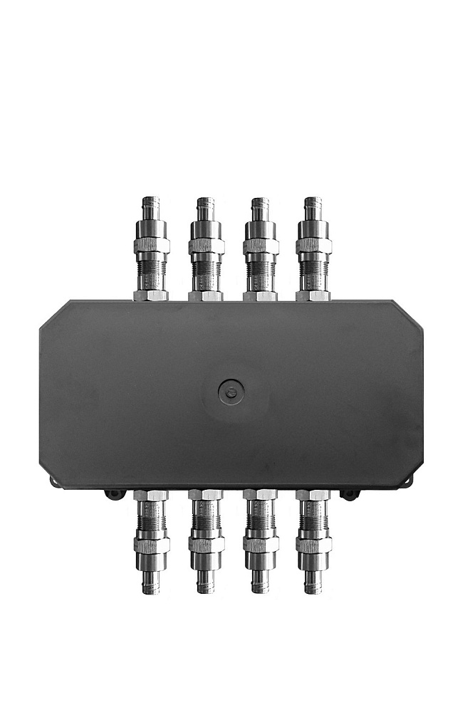 Коробка соединительная взрывозащищённая, 0Ex iа IIC T6 Ga, корпус из ABS-пластика, 8 кабельных вводов из нерж.стали (МКВ М25КМ20) под металлорукав РЗЦ 20 мм, проходной Ø кабеля 10...14 мм, барьерный клеммник Т31 (до 2.5мм.кв.; 300В/30А); t-раб. -55…+60 °С, IP66/67, габ.размеры 302х180х93 мм