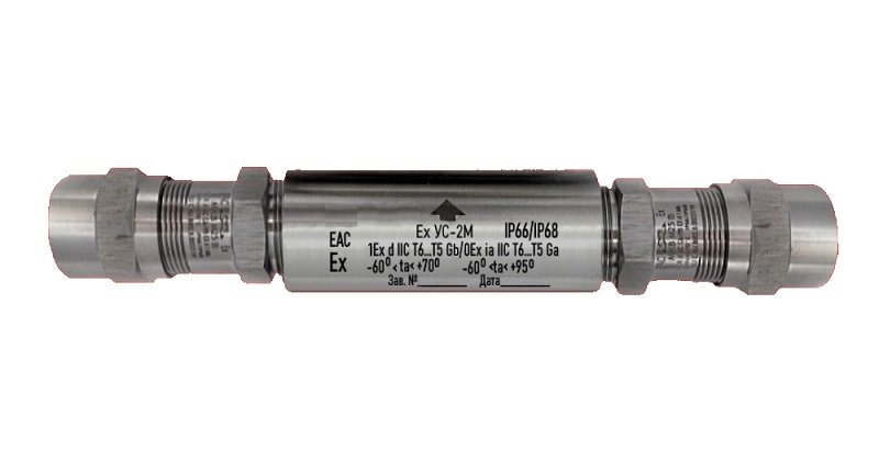 Устройство соединительное взрывозащищенное 1Еx db IIC T6…T5 Gb / 0Еx ia IIC T6…T5 Ga, из нержавеющей стали, комплектуются пластиковыми клеммниками (8 пар) с Ø подкл.кабеля 2,5...10 мм², U-раб. ≤ 400 В, I-раб. ≤ 30 А; IP66/IP68, t-раб. -60...+70°С, габ.размеры Ø36 х 387 мм. Комплектуются сменными металлическими кабельными вводами Ex МКВМ или аналогичными вводами МКВ количеством 2-х штук, может оснащаться резьбовыми переходниками. Материал вводов и переходников определяется при заказе.