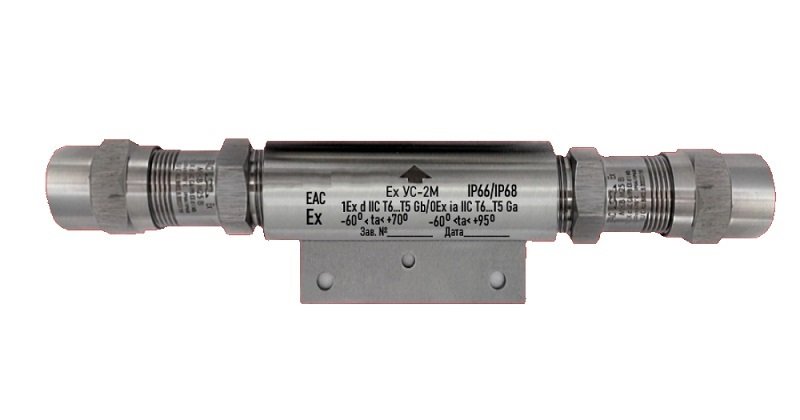 Устройство соединительное взрывозащищенное 1Еx db IIC T6…T5 Gb / 0Еx ia IIC T6…T5 Ga, из нержавеющей стали, комплектуются пластиковыми клеммниками (8 пар) с Ø подкл.кабеля 2,5...10 мм², U-раб. ≤ 400 В, I-раб. ≤ 30 А; IP66/IP68, t-раб. -60...+70°С, габ.размеры Ø36 х 387 мм. Комплектуются сменными металлическими кабельными вводами Ex МКВМ или аналогичными вводами МКВ количеством 2-х штук, может оснащаться резьбовыми переходниками. Материал вводов и переходников определяется при заказе. С крепежной площадкой