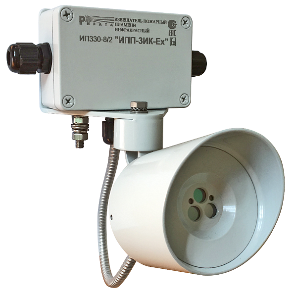 ИК извещатель пламени взрывозащищенный 0ExiaIICT6GaX, самодиагностика, регулировка чувствительности, подогрев; 4-х проводный, до 25 м (ТП5), угол обзора 80°, t-сраб.30 сек; U-пит.12 В, I-потр.20 мА, I-потр.подогр.100 мА; IP65, t-раб.-50...+55°C (с подогревом), 170х180х170 мм