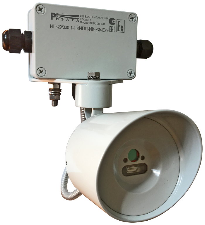 ИК/УФ извещатель пламени взрывозащищенный 0ExiaIIСT6X, самодиагностика, регулировка чувствительности, отключение ИК-канала; 4-х проводный, до 25 м (ТП5), угол обзора 80°, t-сраб.30 сек; U-пит.12 В, I-потр.20 мА; IP65, t-раб.-30...+55°C, 150х170х140 мм